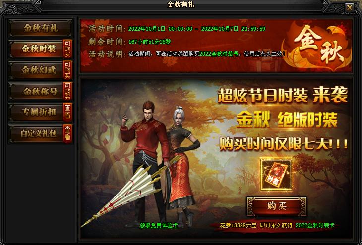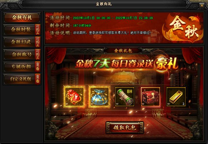1) 金秋有礼--活动期间,每天登录游戏即可领取丰厚大礼!