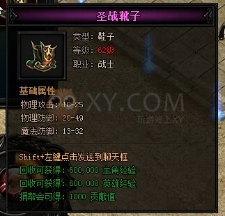 圣战靴子。类型为鞋子。需要等级为62级以上的战士才能装备。基础属性方面——物理攻击:10-25、物理防御:20-49、魔法防御:13-32。回收可获得:600000主角经验+600000英雄经验+1000贡献值。
